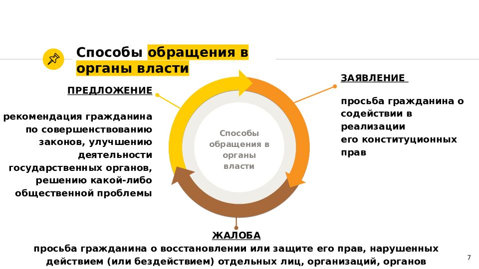 7 ПРЕДЛОЖЕНИЕ рекомендация гражданина по совершенствованию законов, улучшению деятельности государственных органов, решению какой-либо общественной проблемы ЗАЯВЛЕНИЕ просьба гражданина о содействии в реализации его конституционных прав ЖАЛОБА просьба гражданина о восстановлении или защите его прав, нарушенных действием ( или бездействием) отдельных лиц, организаций, органов государства или местного самоуправления Способы обращения в органы власти