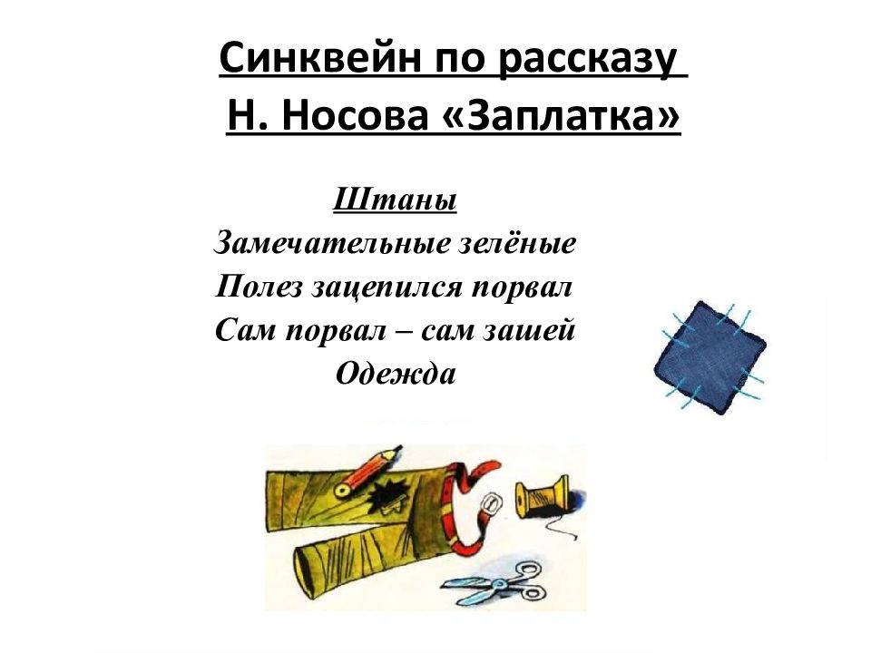 Синквейн по рассказу Н. Носова «Заплатка» Штаны Замечательные зелёные Полез зацепился порвал Сам порвал – сам зашей Одежда