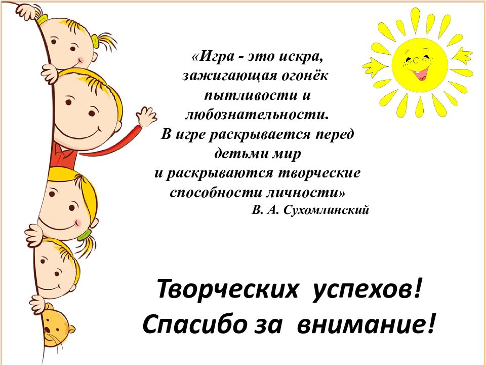 « Игра - это искра, зажигающая огонёк пытливости и любознательности. В игре раскрывается перед детьми мир и раскрываются творческие способности личности » В. А. Сухомлинский Творческих успехов! Спасибо за внимание!