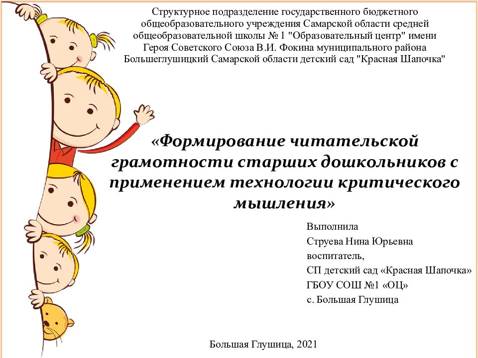 «Формирование читательской грамотности старших дошкольников с применением технологии критического мышления» Выполнила Струева Нина Юрьевна воспитатель, СП детский сад «Красная Шапочка» ГБОУ СОШ №1 «ОЦ» с. Большая Глушица Структурное подразделение государственного бюджетного общеобразовательного учреждения Самарской области средней общеобразовательной школы № 1 "Образовательный центр" имени Героя Советского Союза В.И. Фокина муниципального района Большеглушицкий Самарской области детский сад "Красная Шапочка" Большая Глушица, 2021