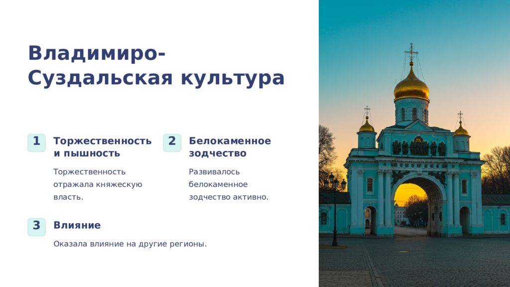 Владимиро-Суздальская культура 1 Торжественность и пышность Торжественность отражала княжескую власть. 2 Белокаменное зодчество Развивалось белокаменное зодчество активно. 3 Влияние Оказала влияние на другие регионы.