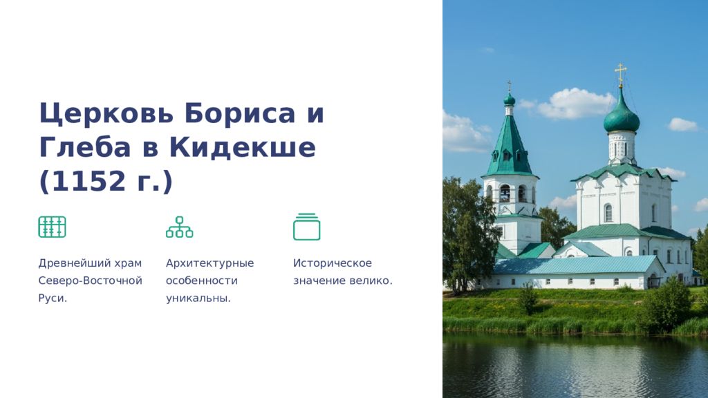 Церковь Бориса и Глеба в Кидекше (1152 г.) Древнейший храм Северо-Восточной Руси. Архитектурные особенности уникальны. Историческое значение велико.