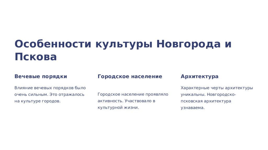Особенности культуры Новгорода и Пскова Вечевые порядки Влияние вечевых порядков было очень сильным. Это отражалось на культуре городов. Городское население Городское население проявляло активность. Участвовало в культурной жизни. Архитектура Характерные черты архитектуры уникальны. Новгородско-псковская архитектура узнаваема.