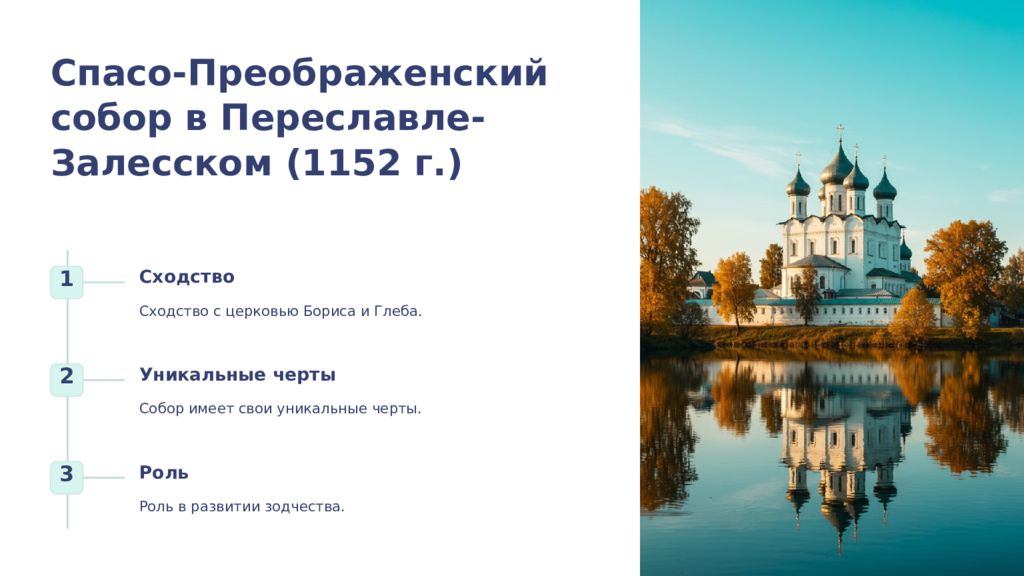 Спасо-Преображенский собор в Переславле-Залесском (1152 г.) 1 Сходство Сходство с церковью Бориса и Глеба. 2 Уникальные черты Собор имеет свои уникальные черты. 3 Роль Роль в развитии зодчества.