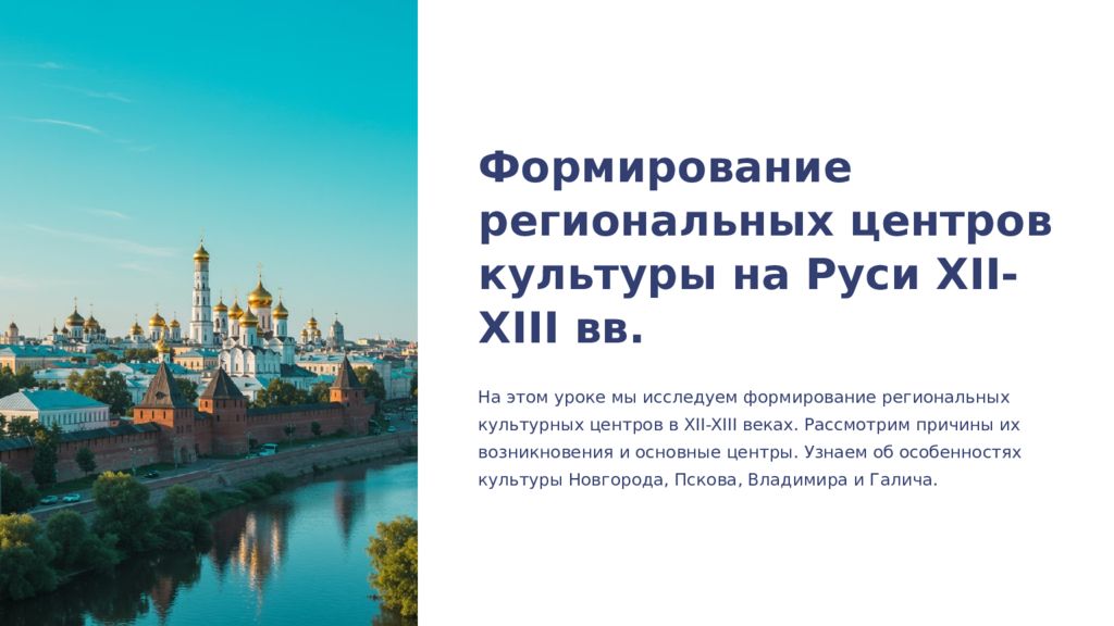 Формирование региональных центров культуры на Руси XII-XIII вв. На этом уроке мы исследуем формирование региональных культурных центров в XII-XIII веках. Рассмотрим причины их возникновения и основные центры. Узнаем об особенностях культуры Новгорода, Пскова, Владимира и Галича.