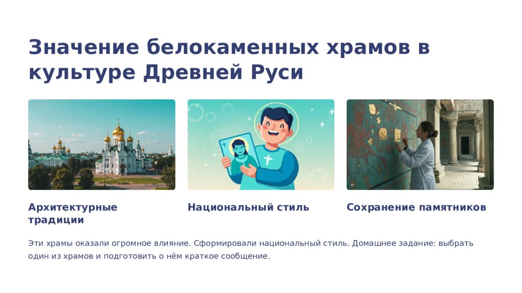 Значение белокаменных храмов в культуре Древней Руси Архитектурные традиции Национальный стиль Сохранение памятников Эти храмы оказали огромное влияние. Сформировали национальный стиль. Домашнее задание: выбрать один из храмов и подготовить о нём краткое сообщение.