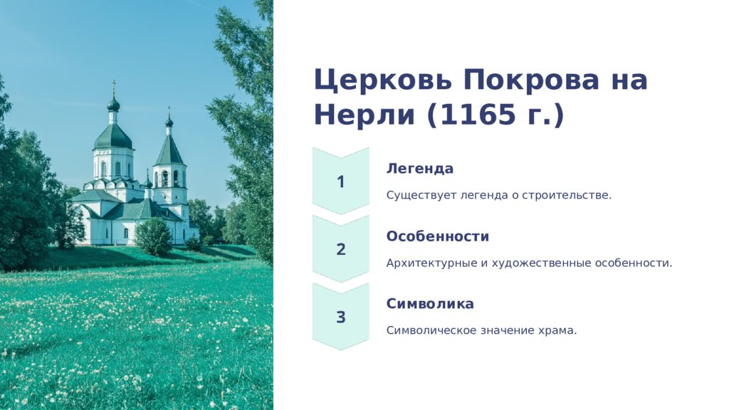 Церковь Покрова на Нерли (1165 г.) Легенда Существует легенда о строительстве. Особенности Архитектурные и художественные особенности. Символика Символическое значение храма.