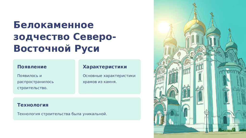 Белокаменное зодчество Северо-Восточной Руси Появление Появилось и распространилось строительство. Характеристики Основные характеристики храмов из камня. Технология Технология строительства была уникальной.