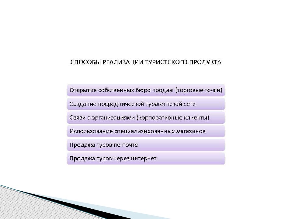 Методы сбыта Варианты прямого сбытового канала: - заказы по почте; - продажи по телефону; - продажи по каталогу; - личные продажи; - собственная розничная сеть; - глобальные компьютерные системы резервирования, интернет. Варианты многоуровневого канала: "Рецептивный ТО – Турист» " Р. ТО - ТА – Т» Р. ТО – Ин. ТО - ТА - Т "Р. ТО – Ин. ТО - ТО опт. - ТА – Т» Р. ТО – Ин.ТО - ТО опт- ТА - Агент-Т прямой сбыт не предполагает наличия посредников косвенный сбыт (многоуровневый канал)