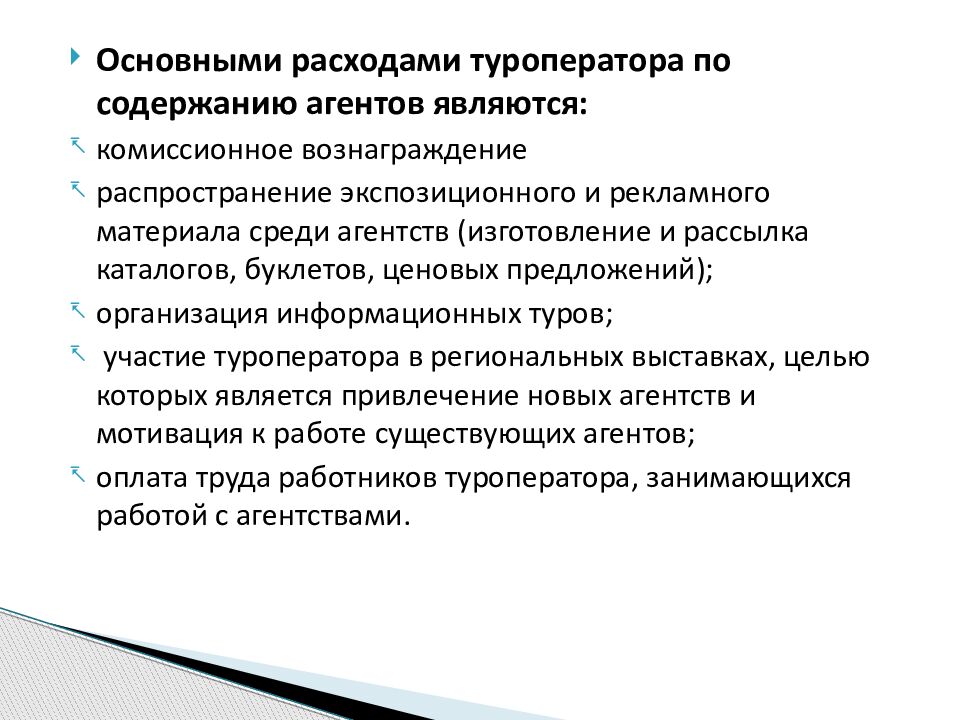 Основными расходами туроператора по содержанию агентов являются: комиссионное вознаграждение распространение экспозиционного и рекламного материала среди агентств (изготовление и рассылка каталогов, буклетов, ценовых предложений); организация информационных туров; участие туроператора в региональных выставках, целью которых является привлечение новых агентств и мотивация к работе существующих агентов; оплата труда работников туроператора, занимающихся работой с агентствами.