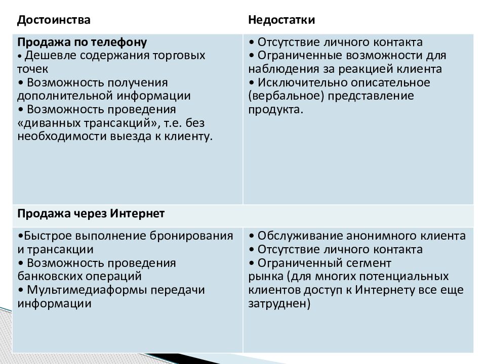 Достоинства Недостатки Продажа по телефону Дешевле содержания торговых точек • Возможность получения дополнительной информации • Возможность проведения «диванных трансакций», т.е. без необходимости выезда к клиенту. • Отсутствие личного контакта • Ограниченные возможности для наблюдения за реакцией клиента • Исключительно описательное (вербальное) представление продукта. Продажа через Интернет •Быстрое выполнение бронирования и трансакции • Возможность проведения банковских операций • Мультимедиаформы передачи информации • Обслуживание анонимного клиента • Отсутствие личного контакта • Ограниченный сегмент рынка (для многих потенциальных клиентов доступ к Интернету все еще затруднен)