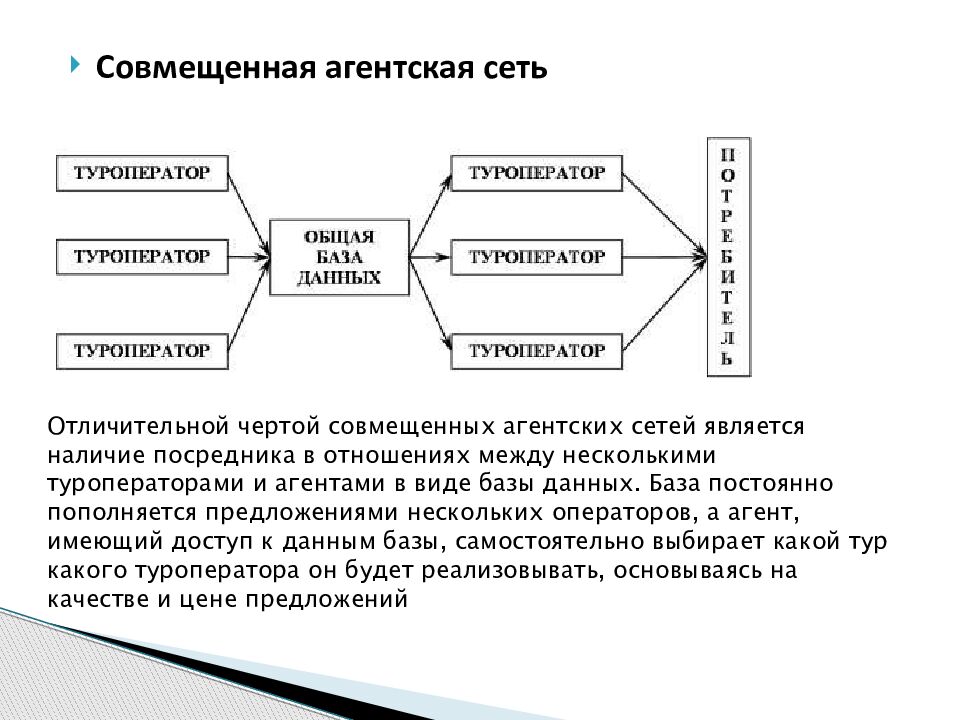 Совмещенная агентская сеть Отличительной чертой совмещенных агентских сетей является наличие посредника в отношениях между несколькими туроператорами и агентами в виде базы данных. База постоянно пополняется предложениями нескольких операторов, а агент, имеющий доступ к данным базы, самостоятельно выбирает какой тур какого туроператора он будет реализовывать, основываясь на качестве и цене предложений