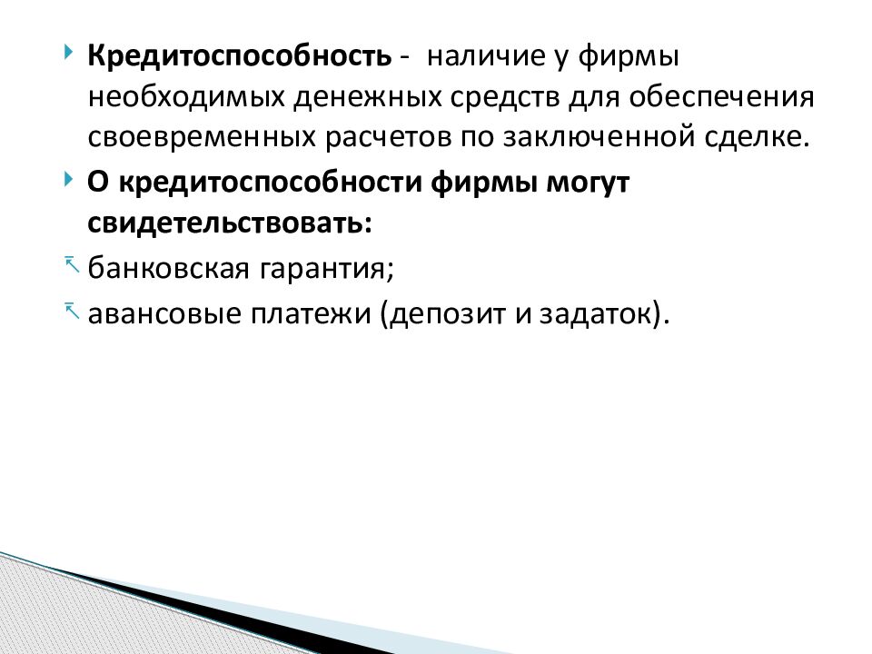 Кредитоспособность - наличие у фирмы необходимых денежных средств для обеспечения своевременных расчетов по заключенной сделке. О кредитоспособности фирмы могут свидетельствовать: банковская гарантия; авансовые платежи (депозит и задаток).