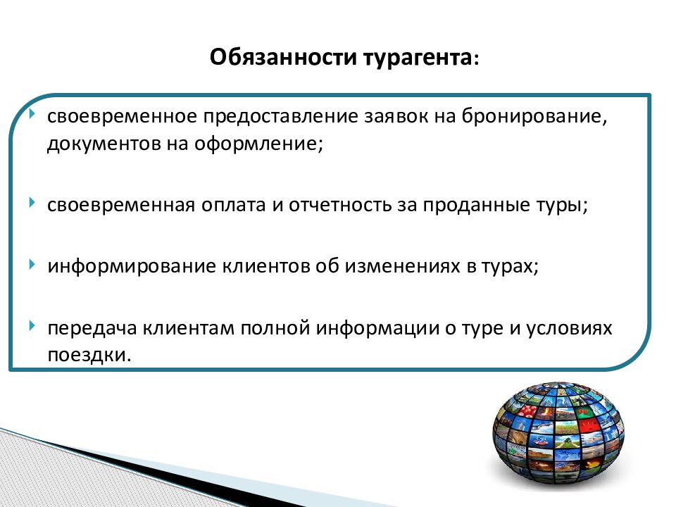 Обязанности турагента : своевременное предоставление заявок на бронирование, документов на оформление; своевременная оплата и отчетность за проданные туры; информирование клиентов об изменениях в турах; передача клиентам полной информации о туре и условиях поездки.