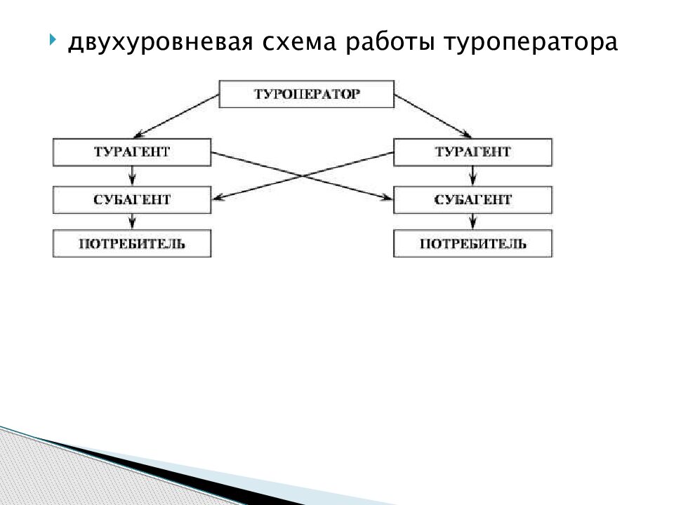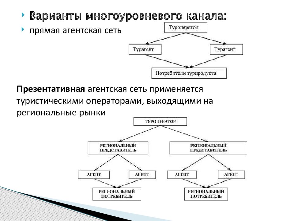 Варианты многоуровневого канала: прямая агентская сеть Презентативная агентская сеть применяется туристическими операторами, выходящими на региональные рынки