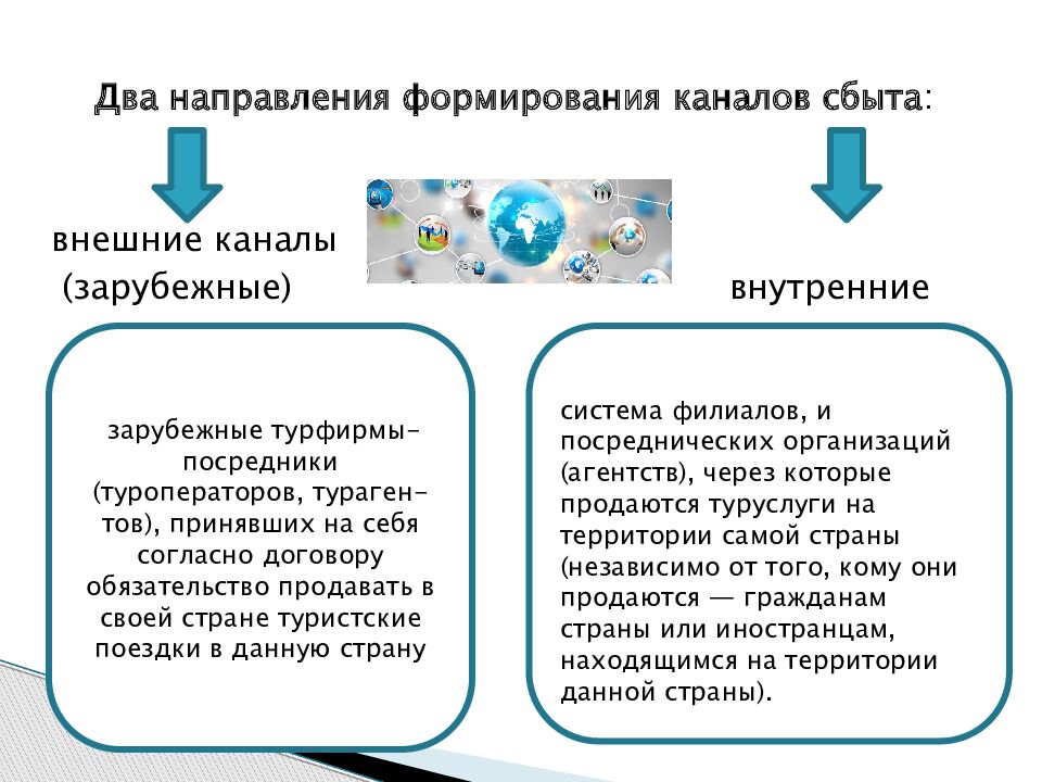 Два направления формирования каналов сбыта : внешние каналы (зарубежные) внутренние зарубежные турфирмы-посредники (туроператоров, тураген-тов ), принявших на себя согласно договору обязательство продавать в своей стране туристские поездки в данную страну Внутренние каналы сбыта — система филиалов, и посреднических организаций (агентств), через которые продаются туруслуги на территории самой страны (независимо от того, кому они продаются — гражданам страны или иностранцам, находящимся на территории данной страны).