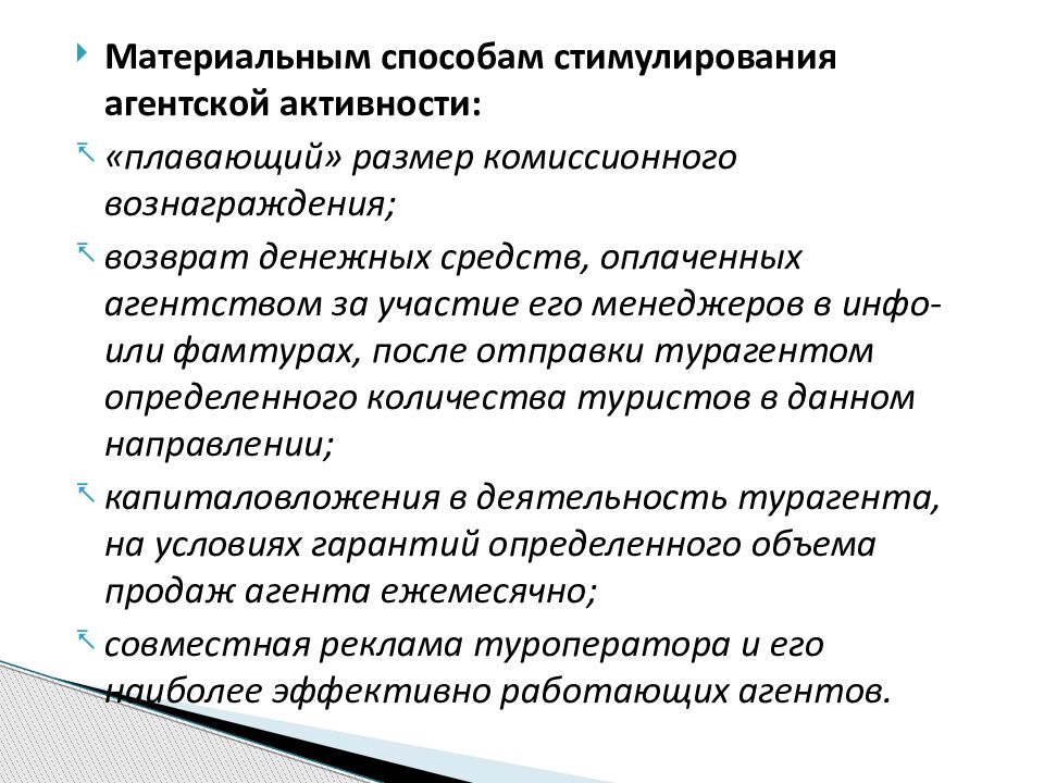 Материальным способам стимулирования агентской активности: «плавающий» размер комиссионного вознаграждения; возврат денежных средств, оплаченных агентством за участие его менеджеров в инфо - или фамтурах, после отправки турагентом определенного количества туристов в данном направлении; капиталовложения в деятельность турагента, на условиях гарантий определенного объема продаж агента ежемесячно; совместная реклама туроператора и его наиболее эффективно работающих агентов.