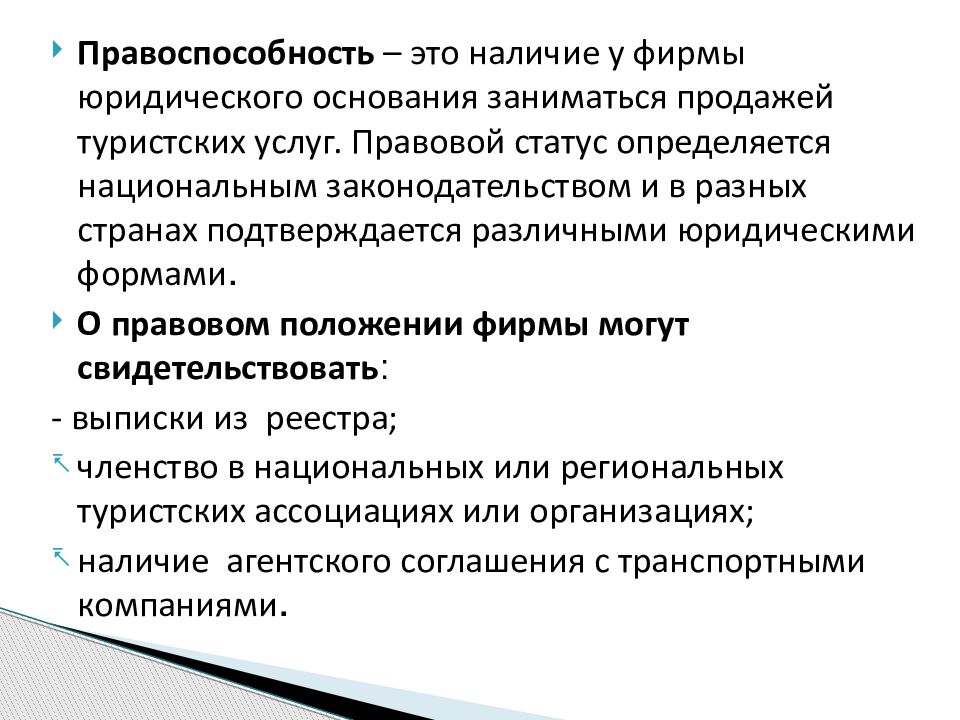 Правоспособность – это наличие у фирмы юридического основания заниматься продажей туристских услуг. Правовой статус определяется национальным законодательством и в разных странах подтверждается различными юридическими формами. О правовом положении фирмы могут свидетельствовать : - выписки из реестра; членство в национальных или региональных туристских ассоциациях или организациях; наличие агентского соглашения с транспортными компаниями.
