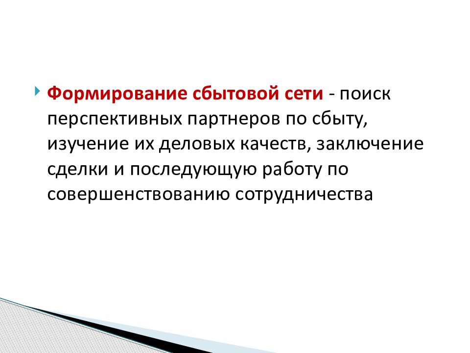 Формирование сбытовой сети - поиск перспективных партнеров по сбыту, изучение их деловых качеств, заключение сделки и последующую работу по совершенствованию сотрудничества