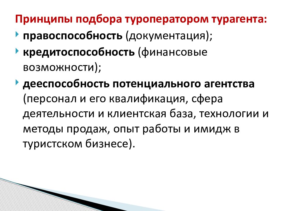 Принципы подбора туроператором турагента : правоспособность (документация); кредитоспособность (финансовые возможности); дееспособность потенциального агентства (персонал и его квалификация, сфера деятельности и клиентская база, технологии и методы продаж, опыт работы и имидж в туристском бизнесе).
