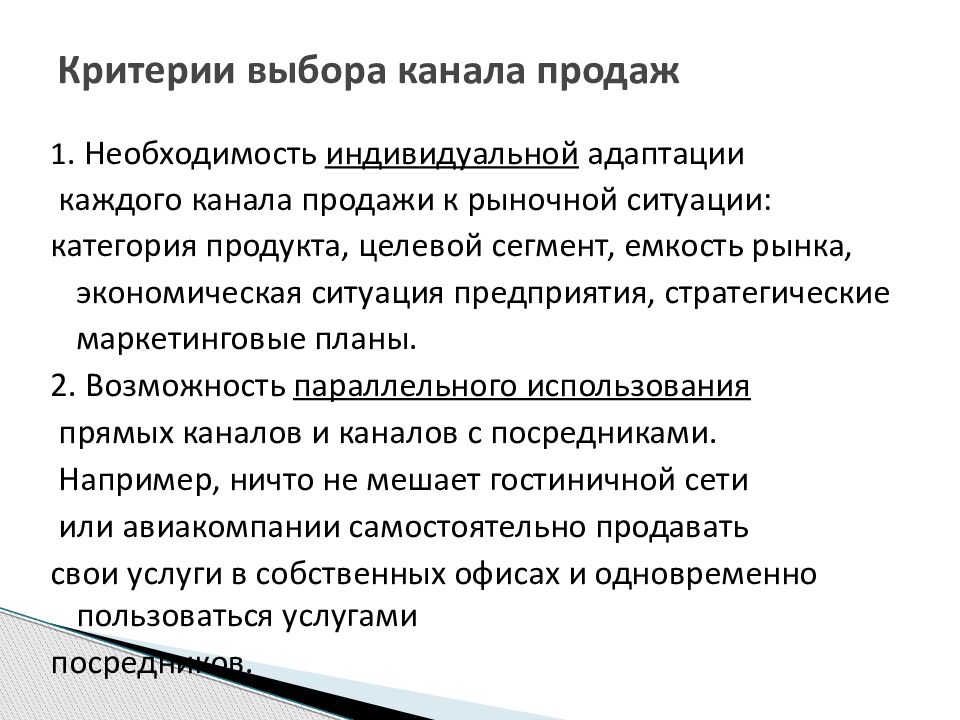 1. Необходимость индивидуальной адаптации каждого канала продажи к рыночной ситуации: категория продукта, целевой сегмент, емкость рынка, экономическая ситуация предприятия, стратегические маркетинговые планы. 2. Возможность параллельного использования прямых каналов и каналов с посредниками. Например, ничто не мешает гостиничной сети или авиакомпании самостоятельно продавать свои услуги в собственных офисах и одновременно пользоваться услугами посредников.