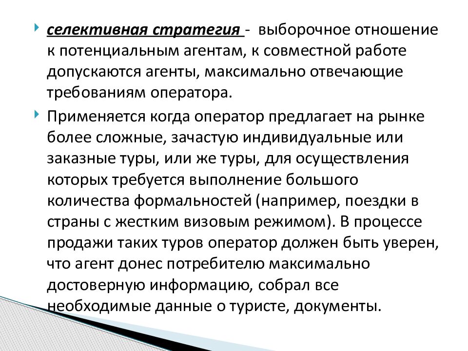 селективная стратегия - выборочное отношение к потенциальным агентам, к совместной работе допускаются агенты, максимально отвечающие требованиям оператора. Применяется когда оператор предлагает на рынке более сложные, зачастую индивидуальные или заказные туры, или же туры, для осуществления которых требуется выполнение большого количества формальностей (например, поездки в страны с жестким визовым режимом). В процессе продажи таких туров оператор должен быть уверен, что агент донес потребителю максимально достоверную информацию, собрал все необходимые данные о туристе, документы.