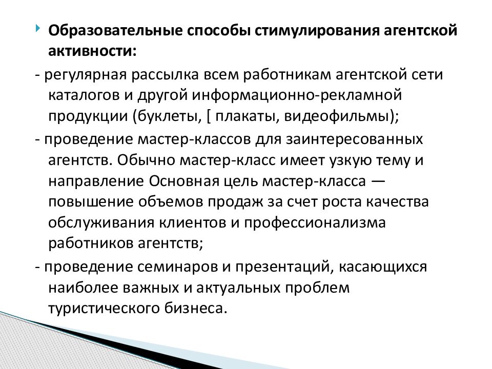 Образовательные способы стимулирования агентской активности: - регулярная рассылка всем работникам агентской сети каталогов и другой информационно-рекламной продукции (буклеты, [ плакаты, видеофильмы); - проведение мастер-классов для заинтересованных агентств. Обычно мастер-класс имеет узкую тему и направление Основная цель мастер-класса — повышение объемов продаж за счет роста качества обслуживания клиентов и профессионализма работников агентств; - проведение семинаров и презентаций, касающихся наиболее важных и актуальных проблем туристического бизнеса.