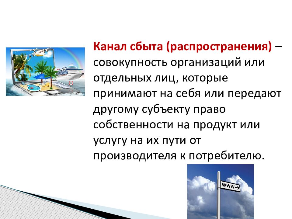 Канал сбыта (распространения) – совокупность организаций или отдельных лиц, которые принимают на себя или передают другому субъекту право собственности на продукт или услугу на их пути от производителя к потребителю.
