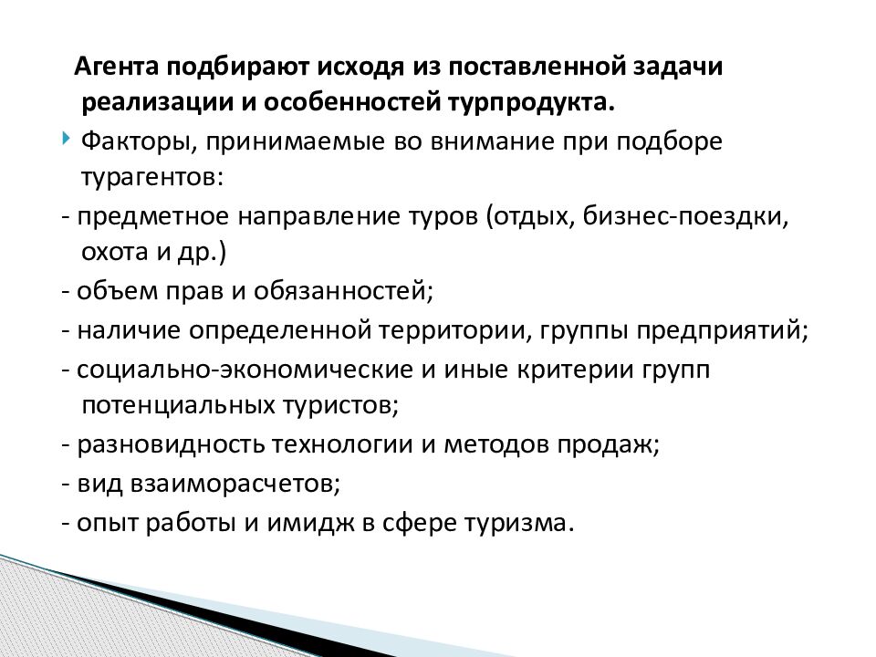 Агента подбирают исходя из поставленной задачи реализации и особенностей турпродукта. Факторы, принимаемые во внимание при подборе турагентов : - предметное направление туров (отдых, бизнес-поездки, охота и др.) - объем прав и обязанностей; - наличие определенной территории, группы предприятий; - социально-экономические и иные критерии групп потенциальных туристов; - разновидность технологии и методов продаж; - вид взаиморасчетов; - опыт работы и имидж в сфере туризма.