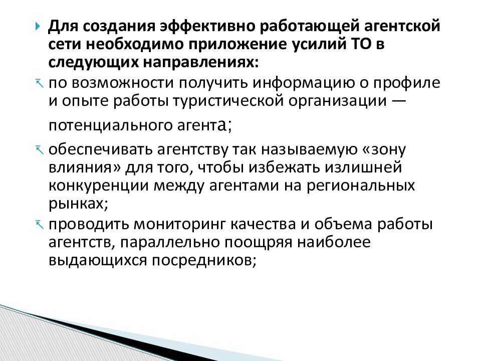 Для создания эффективно работающей агентской сети необходимо приложение усилий ТО в следующих направлениях: по возможности получить информацию о профиле и опыте работы туристической организации — потенциального агент а; обеспечивать агентству так называемую «зону влияния» для того, чтобы избежать излишней конкуренции между агентами на региональных рынках; проводить мониторинг качества и объема работы агентств, параллельно поощряя наиболее выдающихся посредников;