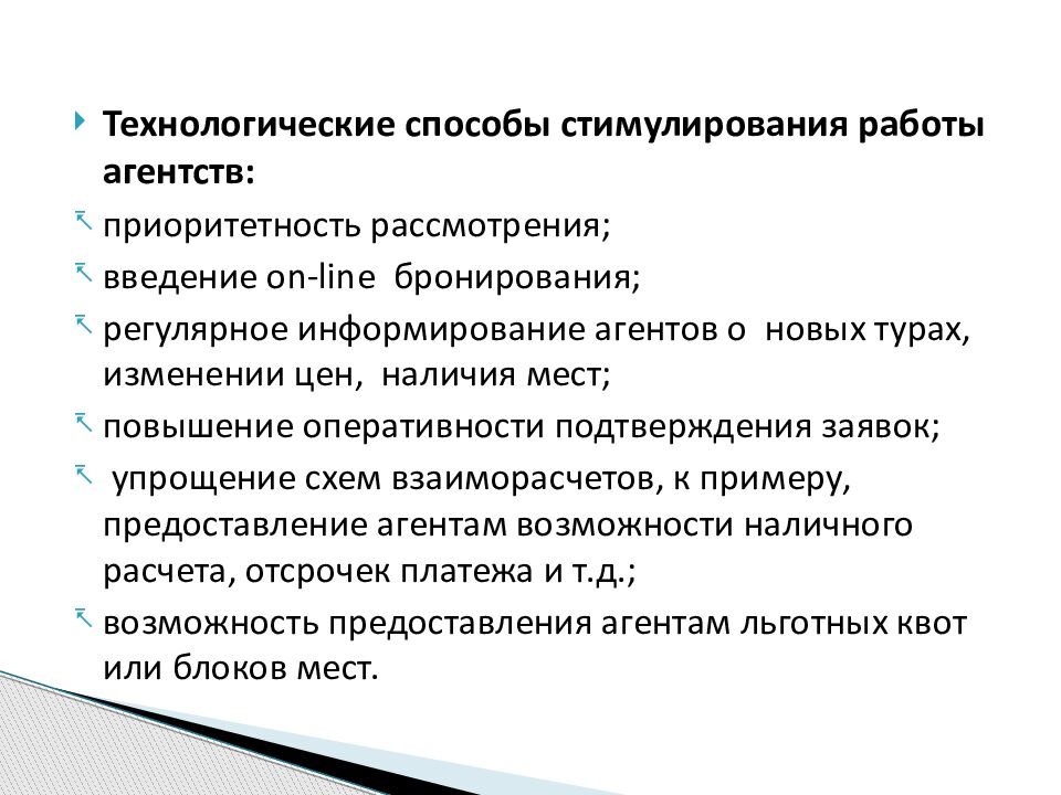 Технологические способы стимулирования работы агентств: приоритетность рассмотрения; введение on-line бронирования; регулярное информирование агентов о новых турах, изменении цен, наличия мест; повышение оперативности подтверждения заявок; упрощение схем взаиморасчетов, к примеру, предоставление агентам возможности наличного расчета, отсрочек платежа и т.д.; возможность предоставления агентам льготных квот или блоков мест.