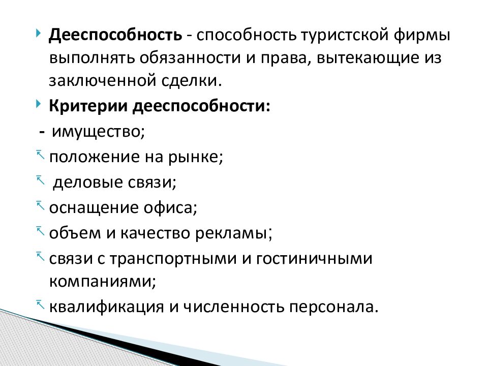 Дееспособность - способность туристской фирмы выполнять обязанности и права, вытекающие из заключенной сделки. Критерии дееспособности: - имущество; положение на рынке; деловые связи; оснащение офиса; объем и качество рекламы ; связи с транспортными и гостиничными компаниями; квалификация и численность персонала.