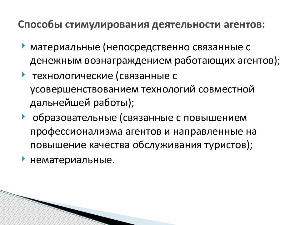 материальные (непосредственно связанные с денежным вознаграждением работающих агентов); технологические (связанные с усовершенствованием технологий совместной дальнейшей работы); образовательные (связанные с повышением профессионализма агентов и направленные на повышение качества обслуживания туристов); нематериальные. Способы стимулирования деятельности агентов:
