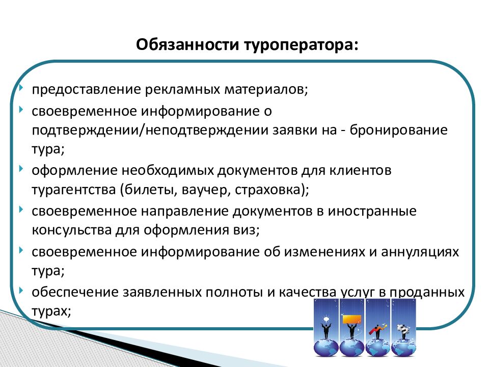 Обязанности туроператора: предоставление рекламных материалов; своевременное информирование о подтверждении/ неподтверждении заявки на - бронирование тура; оформление необходимых документов для клиентов турагентства (билеты, ваучер, страховка); своевременное направление документов в иностранные консульства для оформления виз; своевременное информирование об изменениях и аннуляциях тура; обеспечение заявленных полноты и качества услуг в проданных турах;