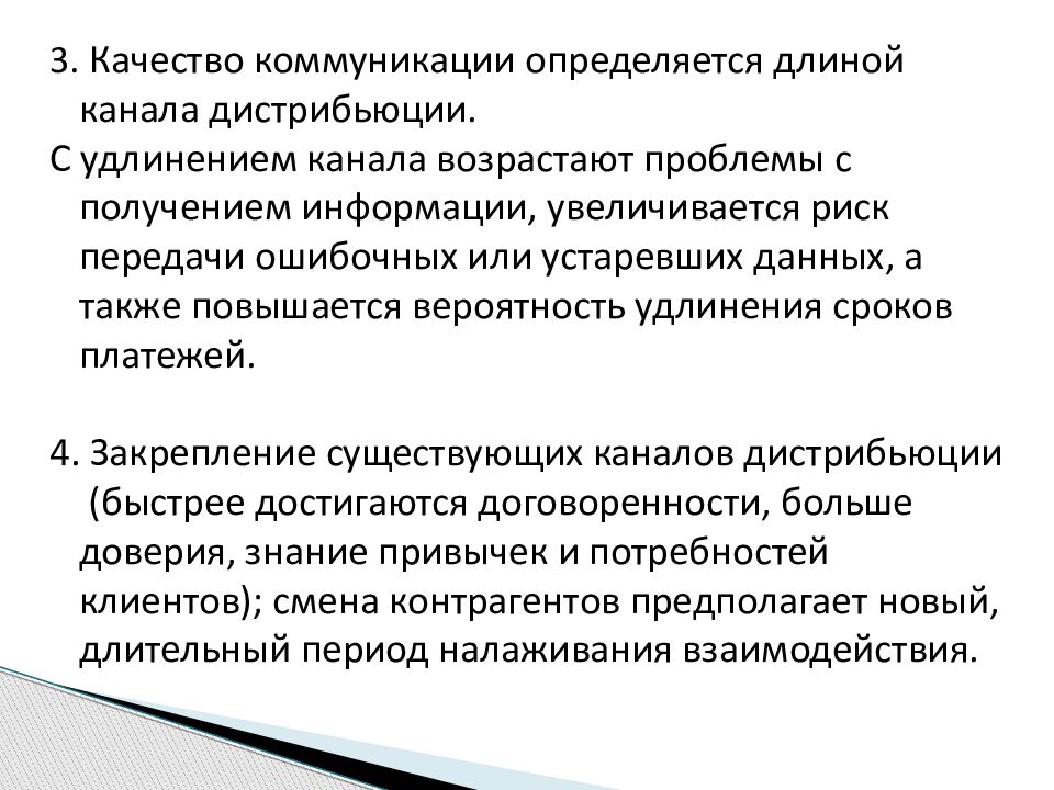 3. Качество коммуникации определяется длиной канала дистрибьюции. С удлинением канала возрастают проблемы с получением информации, увеличивается риск передачи ошибочных или устаревших данных, а также повышается вероятность удлинения сроков платежей. 4. Закрепление существующих каналов дистрибьюции (быстрее достигаются договоренности, больше доверия, знание привычек и потребностей клиентов); смена контрагентов предполагает новый, длительный период налаживания взаимодействия.