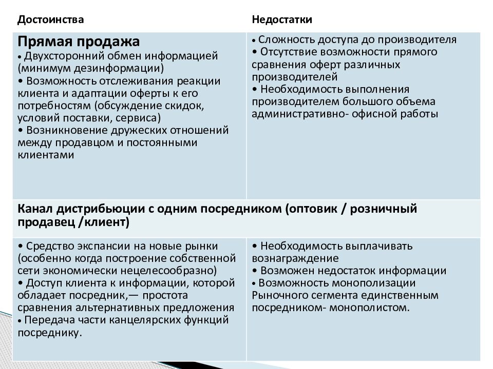 Достоинства Недостатки Прямая продажа Двухсторонний обмен информацией (минимум дезинформации) • Возможность отслеживания реакции клиента и адаптации оферты к его потребностям (обсуждение скидок, условий поставки, сервиса) • Возникновение дружеских отношений между продавцом и постоянными клиентами Сложность доступа до производителя • Отсутствие возможности прямого сравнения оферт различных производителей • Необходимость выполнения производителем большого объема административно- офисной работы Канал дистрибьюции с одним посредником (оптовик / розничный продавец /клиент) • Средство экспансии на новые рынки (особенно когда построение собственной сети экономически нецелесообразно) • Доступ клиента к информации, которой обладает посредник,— простота сравнения альтернативных предложения Передача части канцелярских функций посреднику. • Необходимость выплачивать вознаграждение • Возможен недостаток информации Возможность монополизации Рыночного сегмента единственным посредником- монополистом.