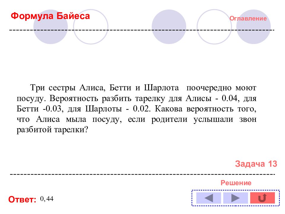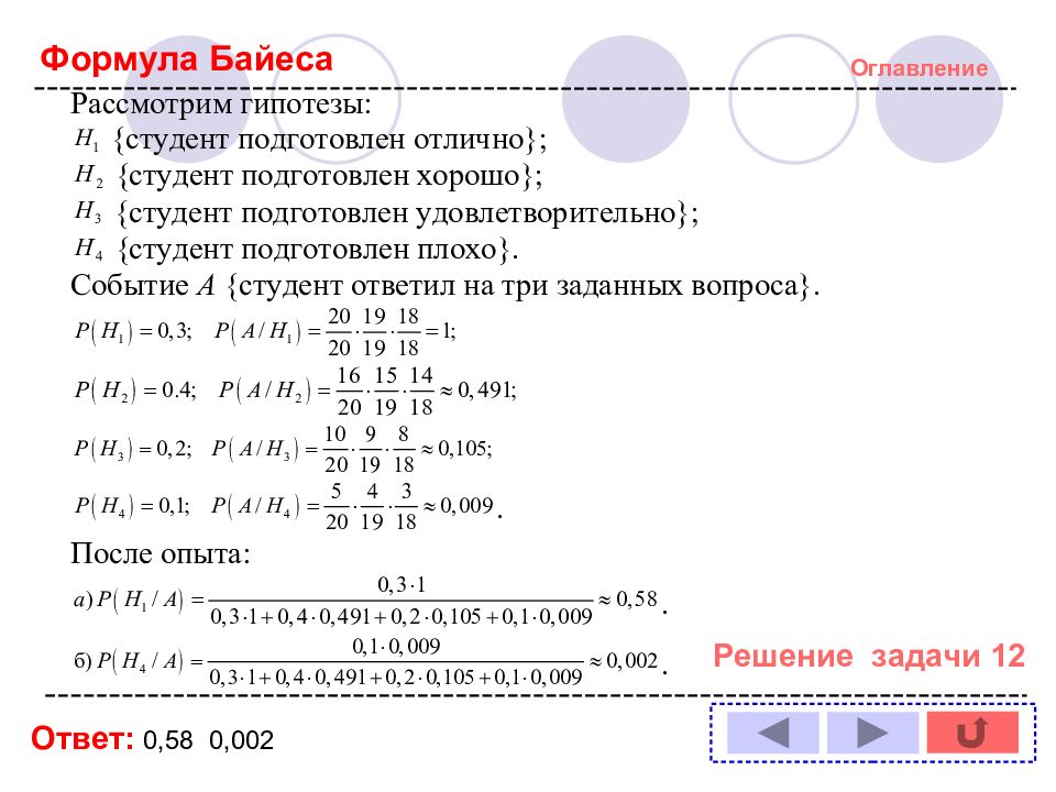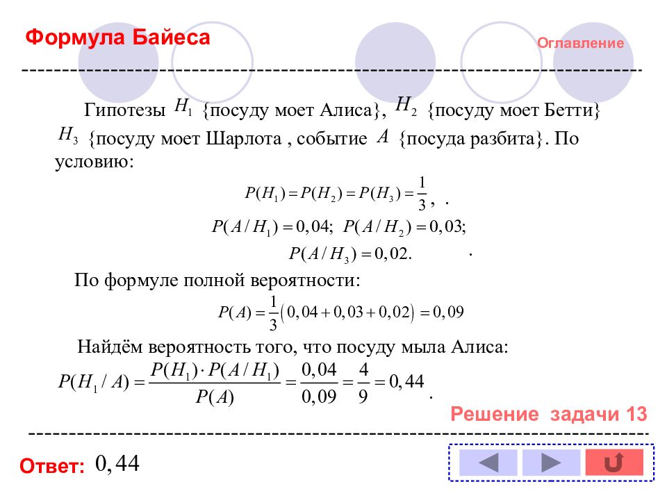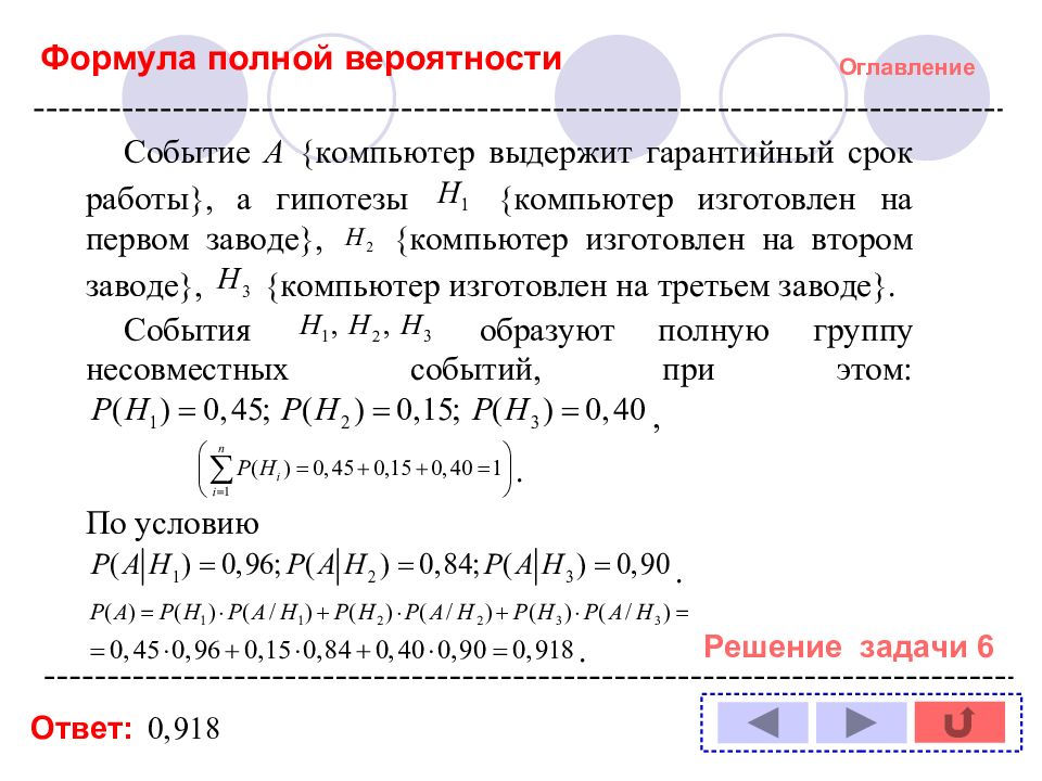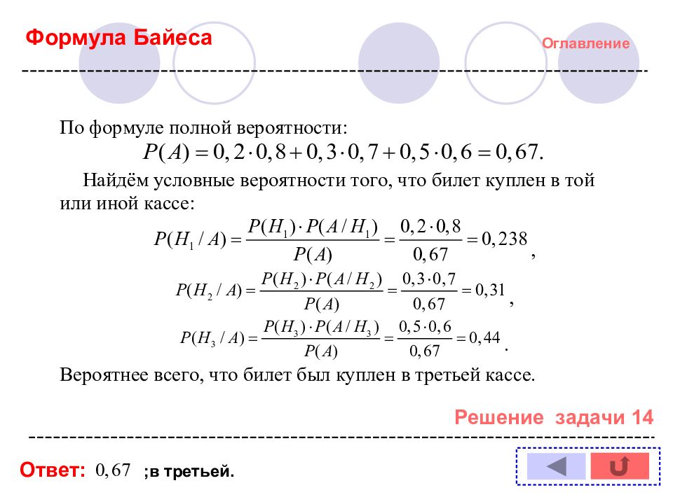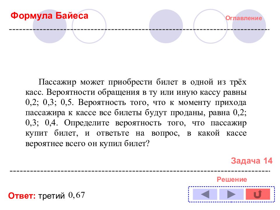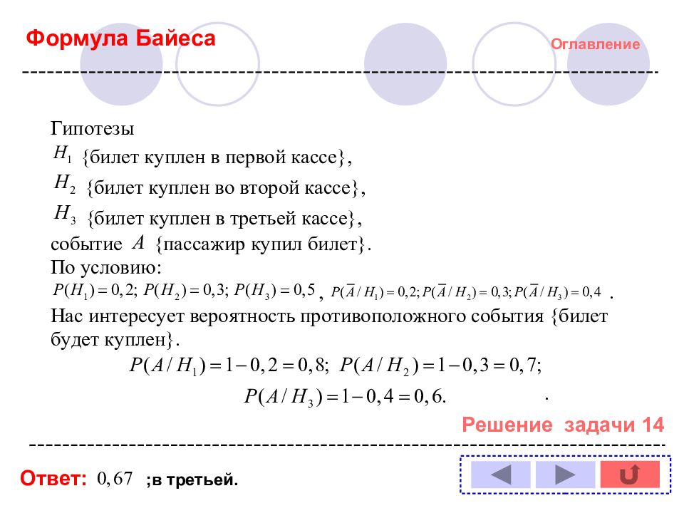 Оглавление Решение задачи № : 1 11 2 12 3 13 4 14 5 6 7 8 9 10 Формула полной вероятности Формула Байеса