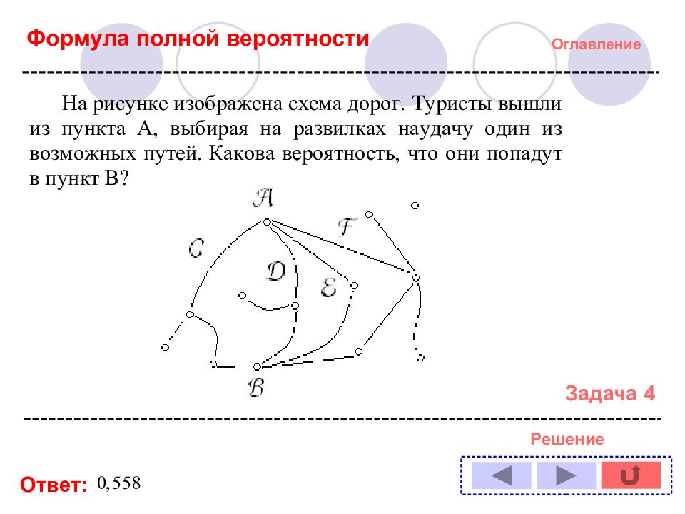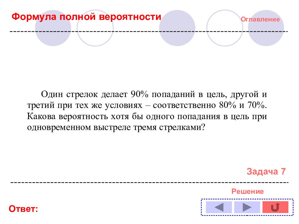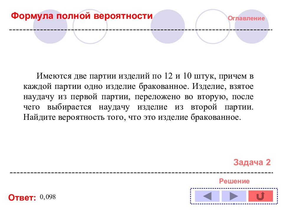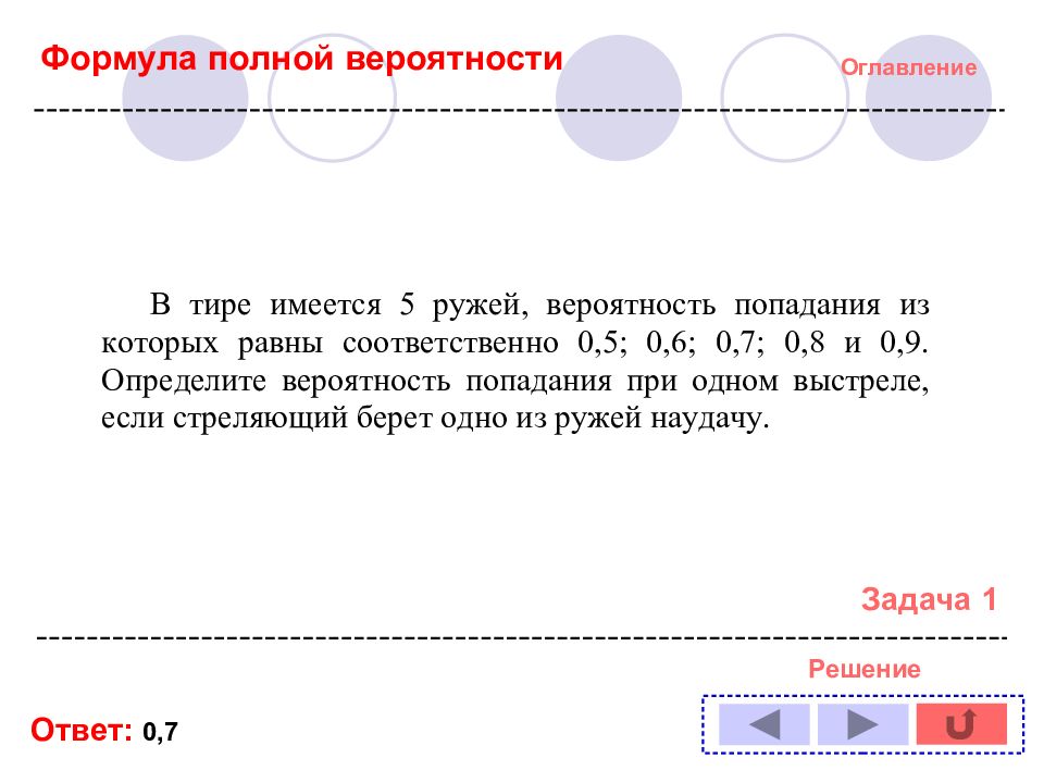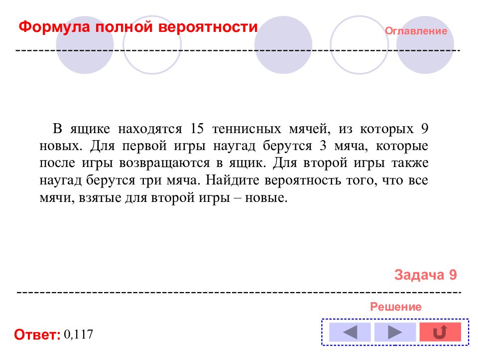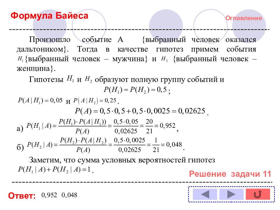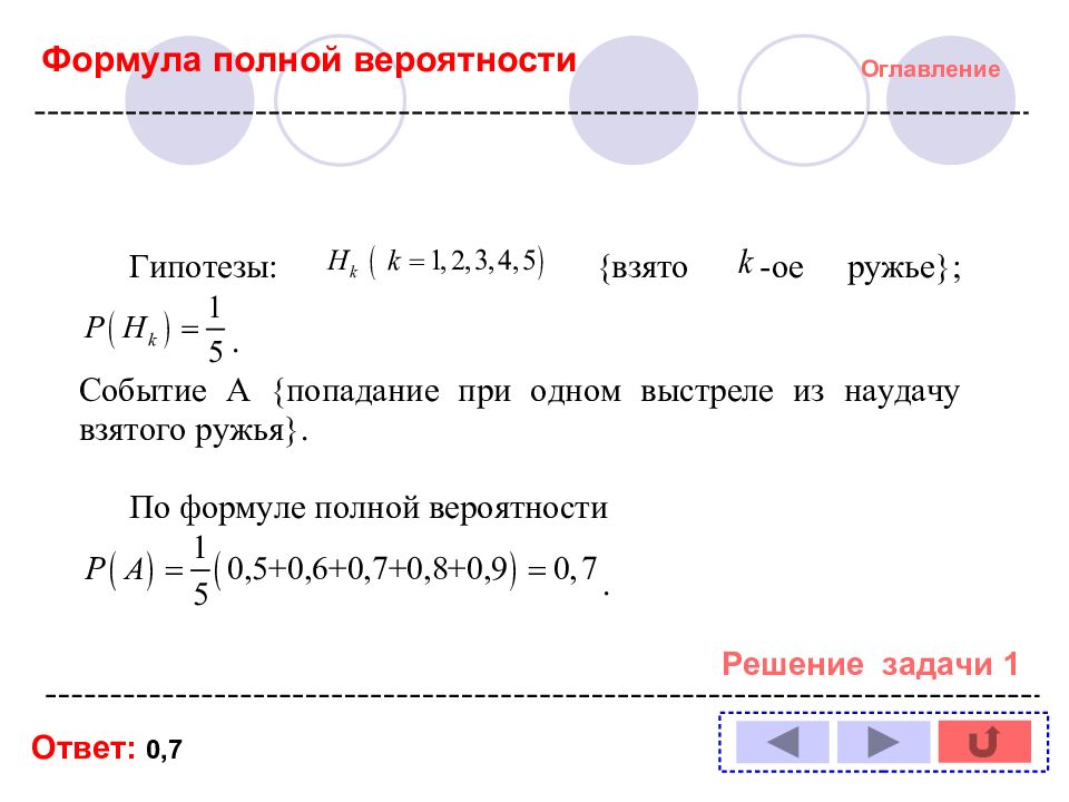 Оглавление Решение задачи № : 1 11 2 12 3 13 4 14 5 6 7 8 9 10 Формула полной вероятности Формула Байеса