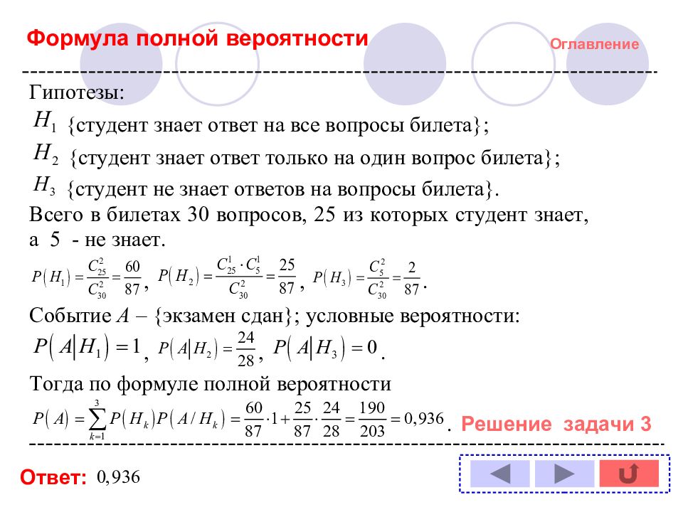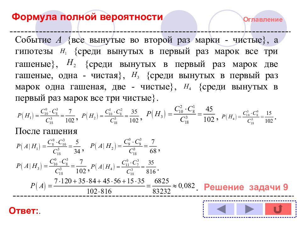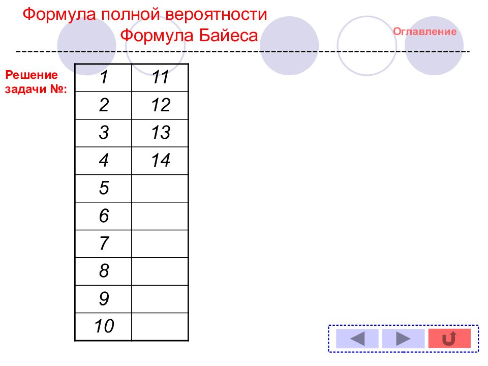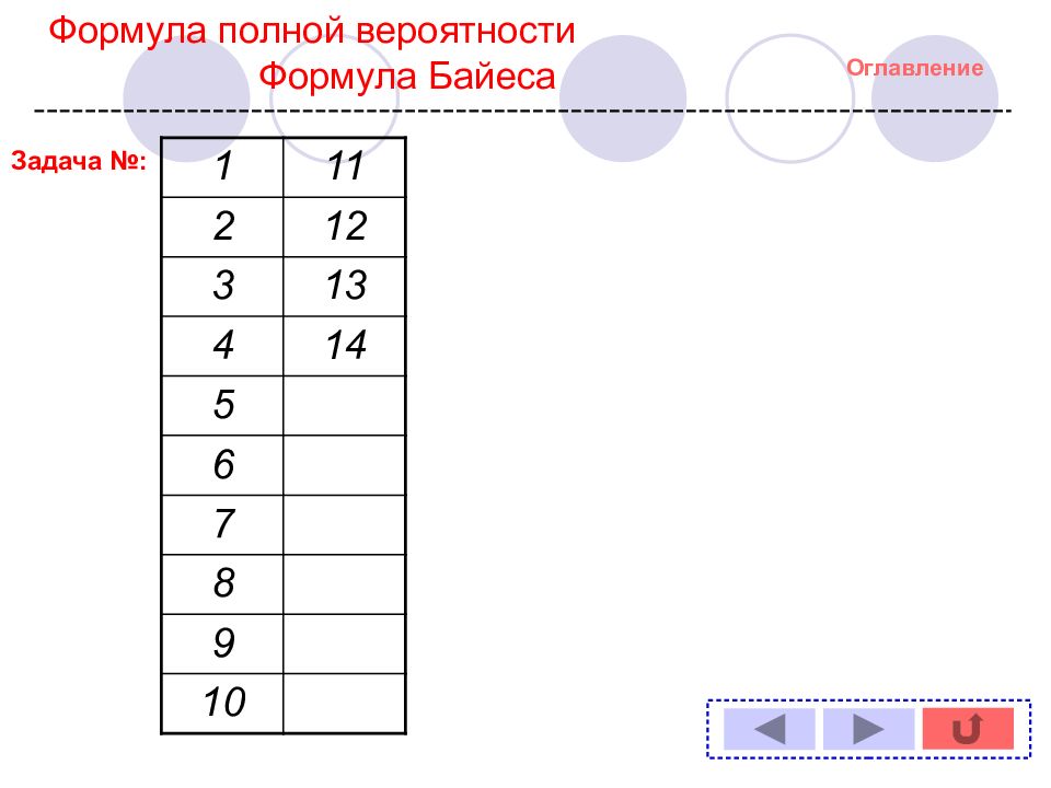 Оглавление Задача № : 1 11 2 12 3 13 4 14 5 6 7 8 9 10 Формула полной вероятности Формула Байеса