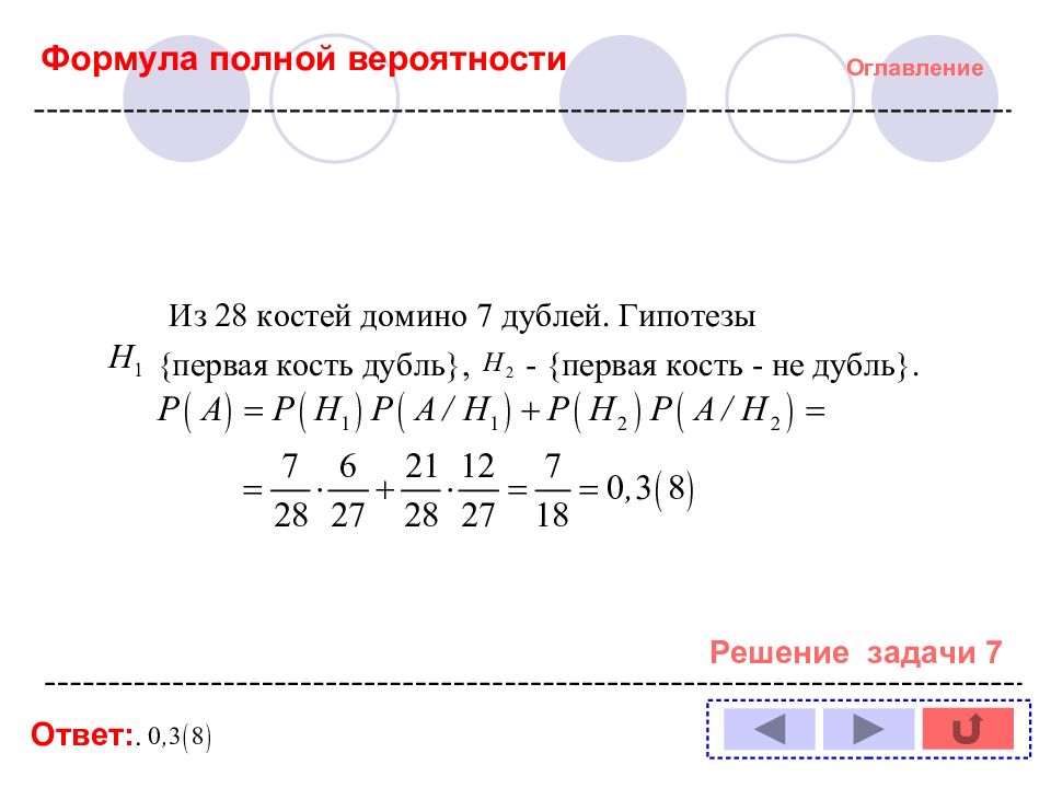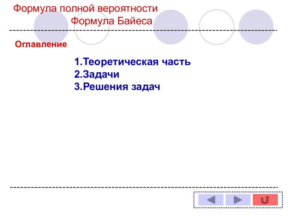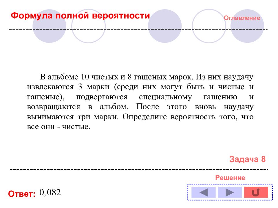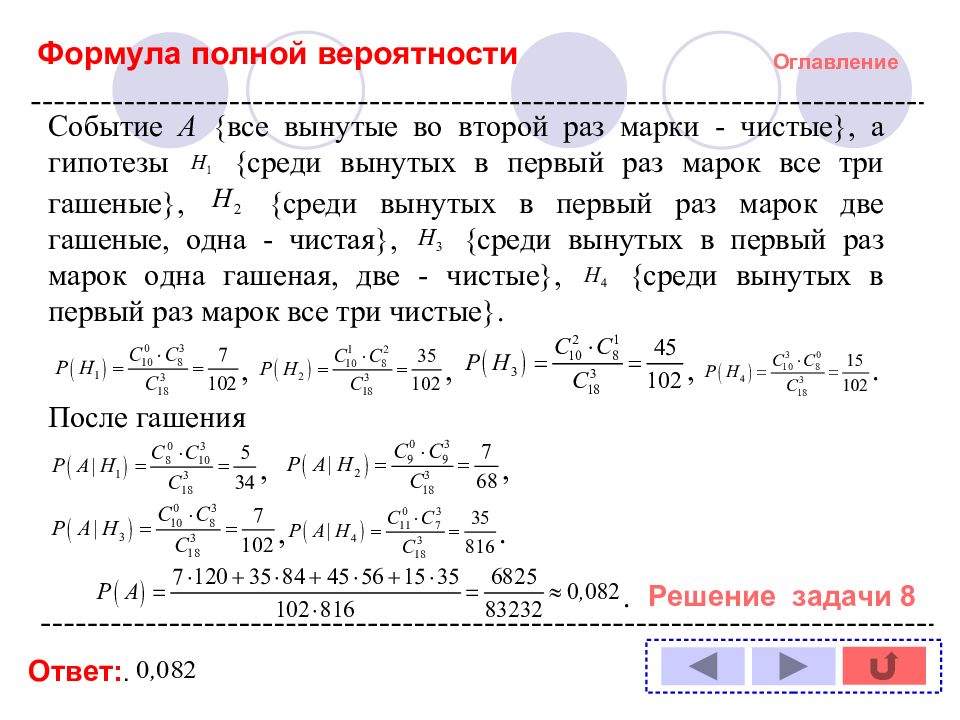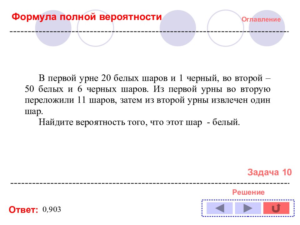 Оглавление Задача № : 1 11 2 12 3 13 4 14 5 6 7 8 9 10 Формула полной вероятности Формула Байеса