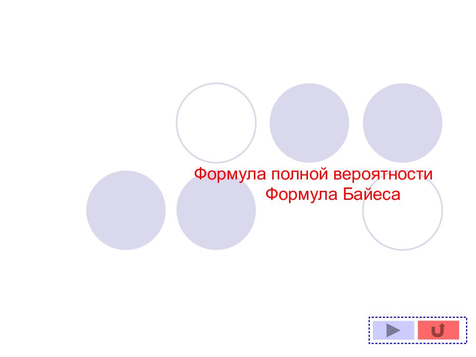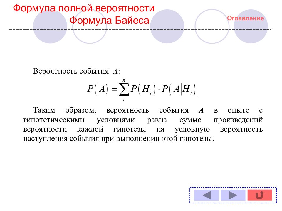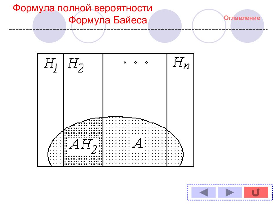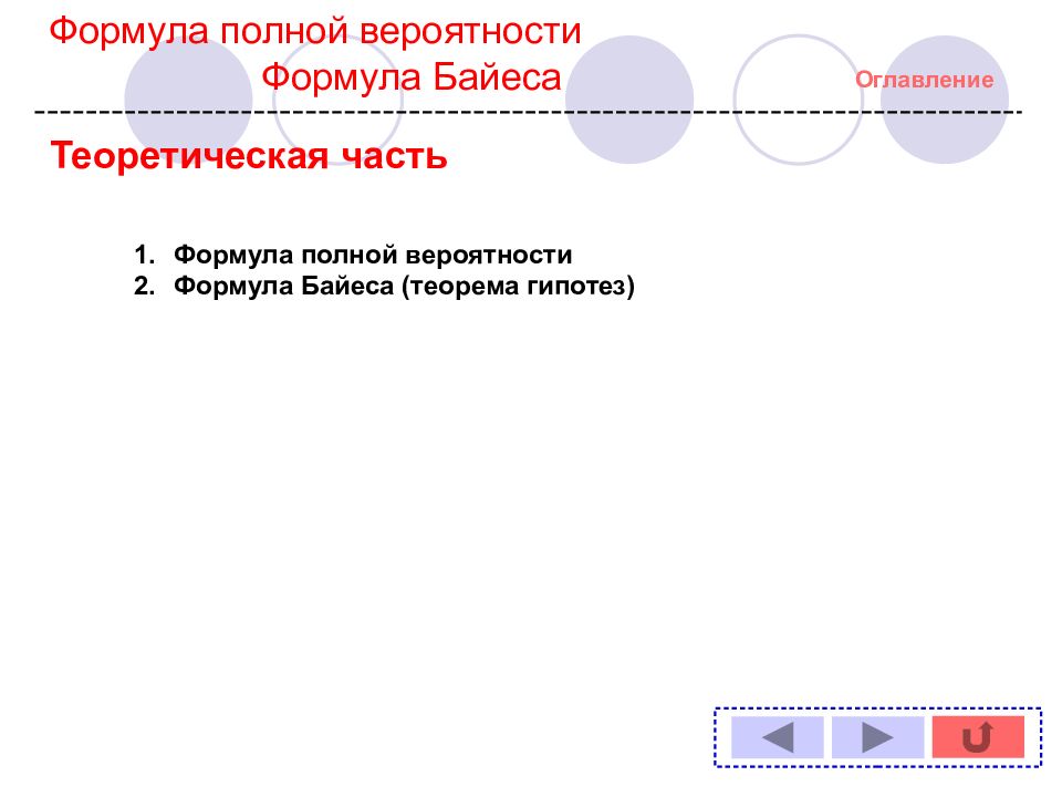 Теоретическая часть Оглавление Формула полной вероятности Формула Байеса (теорема гипотез) Формула полной вероятности Формула Байеса