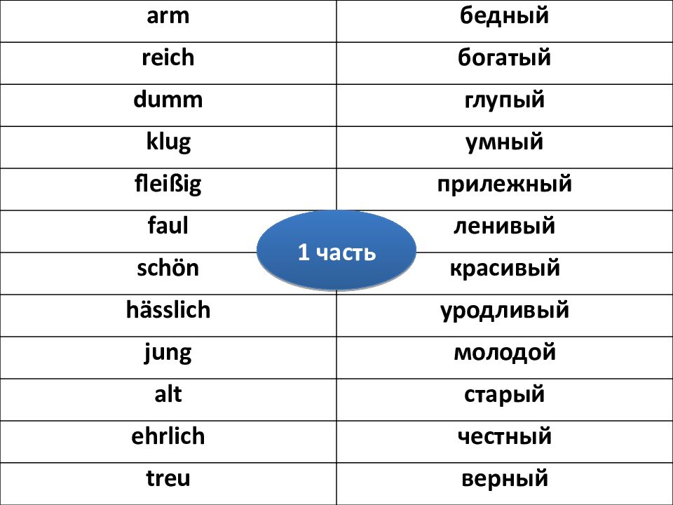 arm бедный reich богатый dumm глупый klug умный fleißig прилежный faul ленивый schön красивый hässlich уродливый jung молодой alt старый ehrlich честный treu верный 1 часть