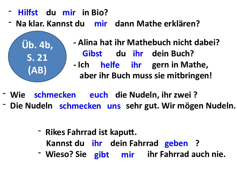... du... in Bio? Na klar. Kannst du... dann Mathe erklären? - Alina hat ihr Mathebuch nicht dabei? ... du... dein Buch? - Ich...... gern in Mathe, aber ihr Buch muss sie mitbringen! Wie...... die Nudeln, ihr zwei ? Die Nudeln...... sehr gut. Wir mögen Nudeln. Rikes Fahrrad ist kaputt. Kannst du... dein Fahrrad... ? Wieso? Sie...... ihr Fahrrad auch nie. Hilfst mir mir Gibst ihr helfe ihr schmecken euch schmecken uns ihr geben gibt mir Üb. 4b, S. 21 (AB)