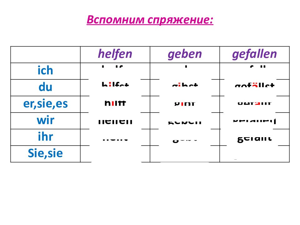 helfen geben gefallen ich helfe gebe gefalle du h i lfst g i bst gef ä llst er,sie,es h i lft g i bt gef ä llt wir helfen geben gefallen ihr helft gebt gef allt Sie,sie helfen geben gefallen