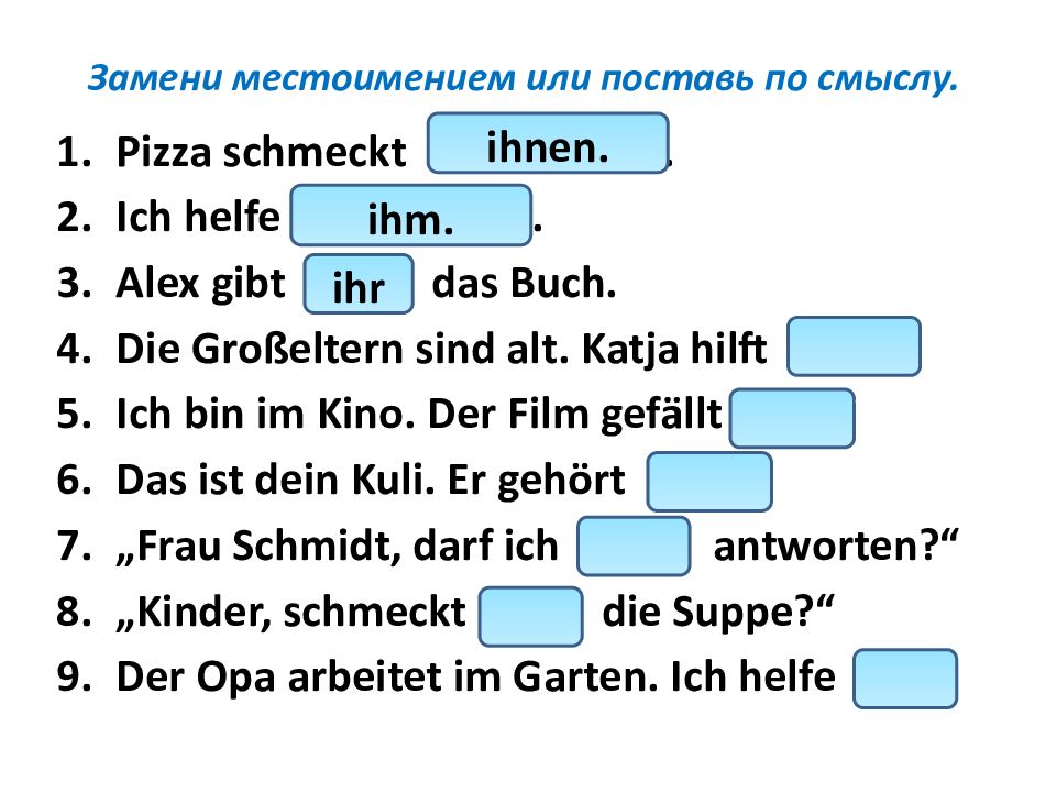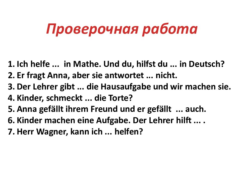 Проверочная работа Ich helfe... in Mathe. Und du, hilfst du... in Deutsch? Er fragt Anna, aber sie antwortet... nicht. Der Lehrer gibt... die Hausaufgabe und wir machen sie. Kinder, schmeckt... die Torte? Anna gefällt ihrem Freund und er gefällt... auch. Kinder machen eine Aufgabe. Der Lehrer hilft.... Herr Wagner, kann ich... helfen?