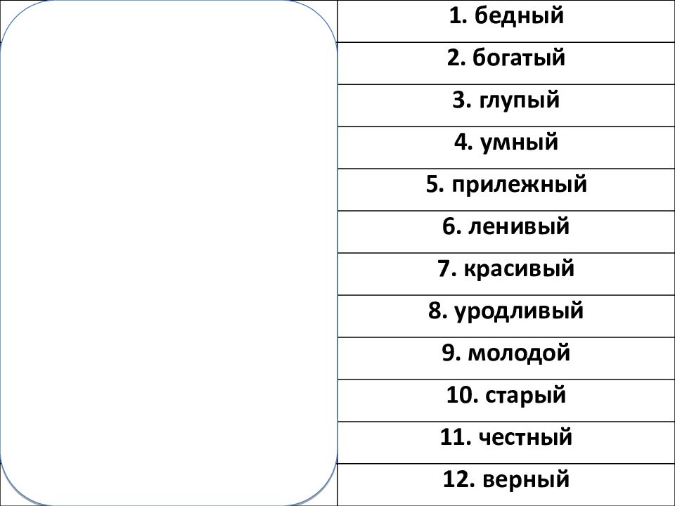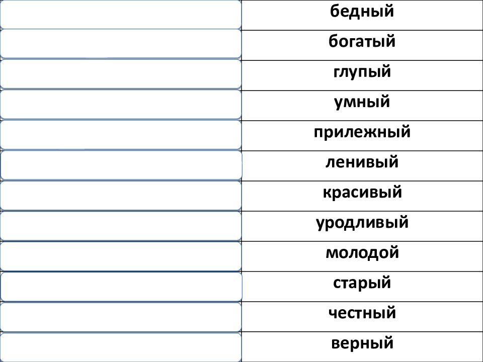 arm 1. бедный reich 2. богатый dumm 3. глупый klug 4. умный fleißig 5. прилежный faul 6. ленивый schön 7. красивый hässlich 8. уродливый jung 9. молодой alt 10. старый ehrlich 11. честный treu 12. верный