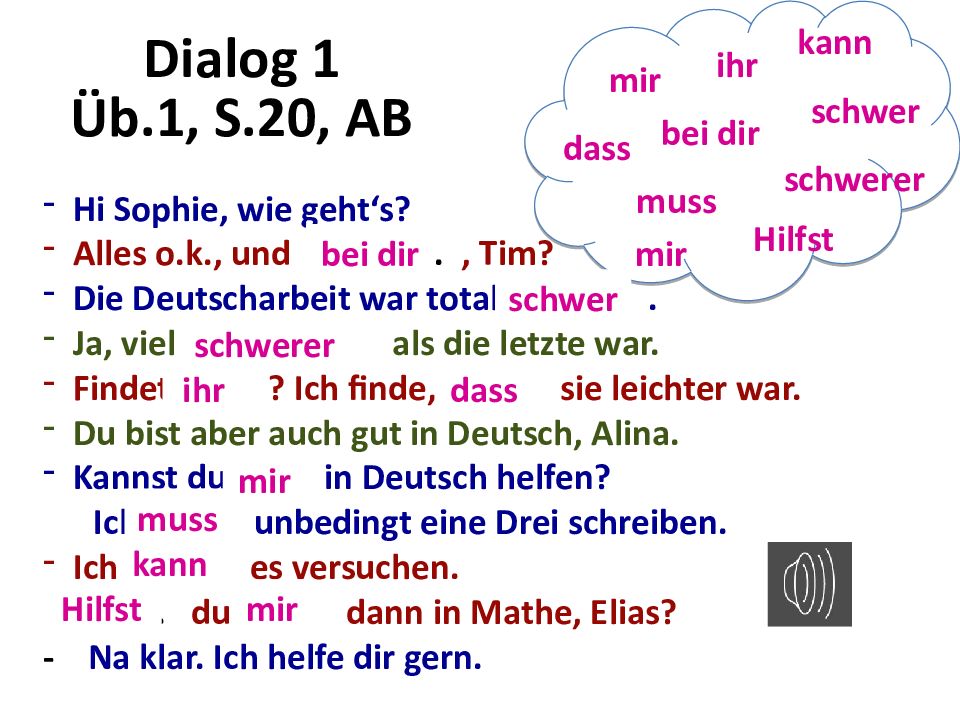 Hi Sophie, wie geht‘s? Alles o.k., und......, Tim? Die Deutscharbeit war total.... Ja, viel... als die letzte war. Findet... ? Ich finde,... sie leichter war. Du bist aber auch gut in Deutsch, Alina. Kannst du... in Deutsch helfen? Ich... unbedingt eine Drei schreiben. Ich... es versuchen. ... du... dann in Mathe, Elias? - Na klar. Ich helfe dir gern. kann mir ihr schwer bei dir schwerer dass muss Hilfst mir bei dir schwer schwerer ihr dass mir muss kann Hilfst mir