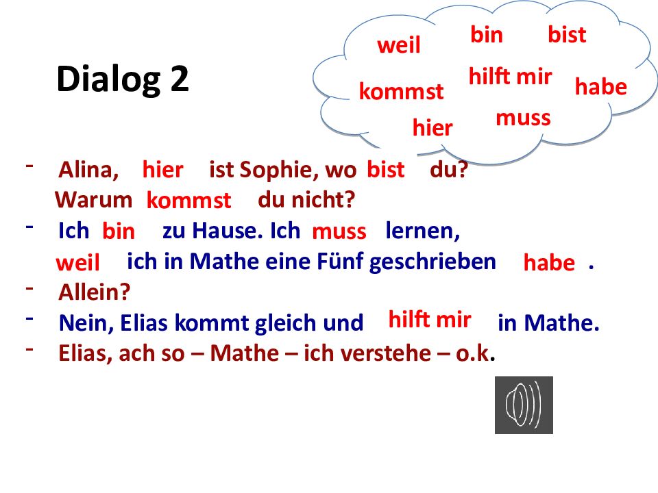 Dialog 2 Alina,... ist Sophie, wo... du? Warum... du nicht? Ich... zu Hause. Ich... lernen, ... ich in Mathe eine Fünf geschrieben.... Allein? Nein, Elias kommt gleich und...... in Mathe. Elias, ach so – Mathe – ich verstehe – o.k. weil weil bin bin bist bist hilft mir hilft mir kommst kommst habe habe muss muss hier hier