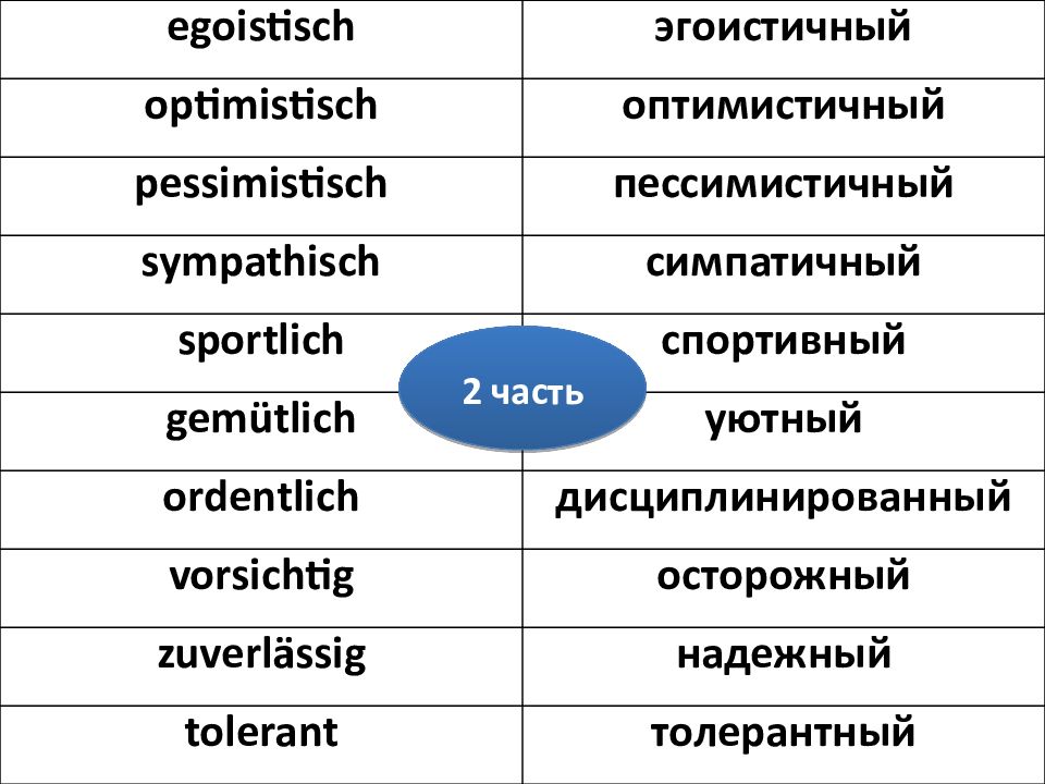 egoistisch эгоистичный optimistisch оптимистичный pessimistisch пессимистичный sympathisch симпатичный sportlich спортивный gemütlich уютный ordentlich дисциплинированный vorsichtig осторожный zuverlässig надежный tolerant толерантный 2 часть