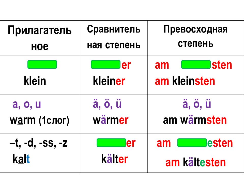 Прилагатель ное Сравнитель ная степень Превосходная степень klein er klein er am sten am klein sten a, o, u w a rm (1 слог) ä, ö, ü w ä rm er ä, ö, ü am w ä rm sten –t, -d, -ss, -z k a l t er k ä lt er am e sten am k ä lt e sten